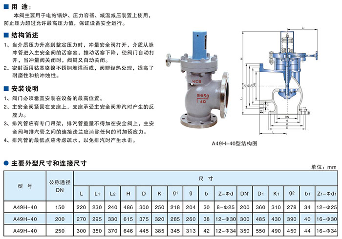 主安全閥主要用于電站鍋爐、壓力容器、減溫減壓裝置上使用,防止壓力超過允許最高壓力值,保證設備安全運行。當介質(zhì)壓力升高到整定壓力時,沖量安全閥打開,介質(zhì)從脈沖管進入主安全閥的活塞室,推動活塞下降,使閥門自動打開,當沖量閥關閉時,閥瓣又自動關閉。密封面用鈷基鉻鎳不銹鋼堆焊而成,閥瓣經(jīng)熱處理,提高了耐磨性和抗沖蝕性。